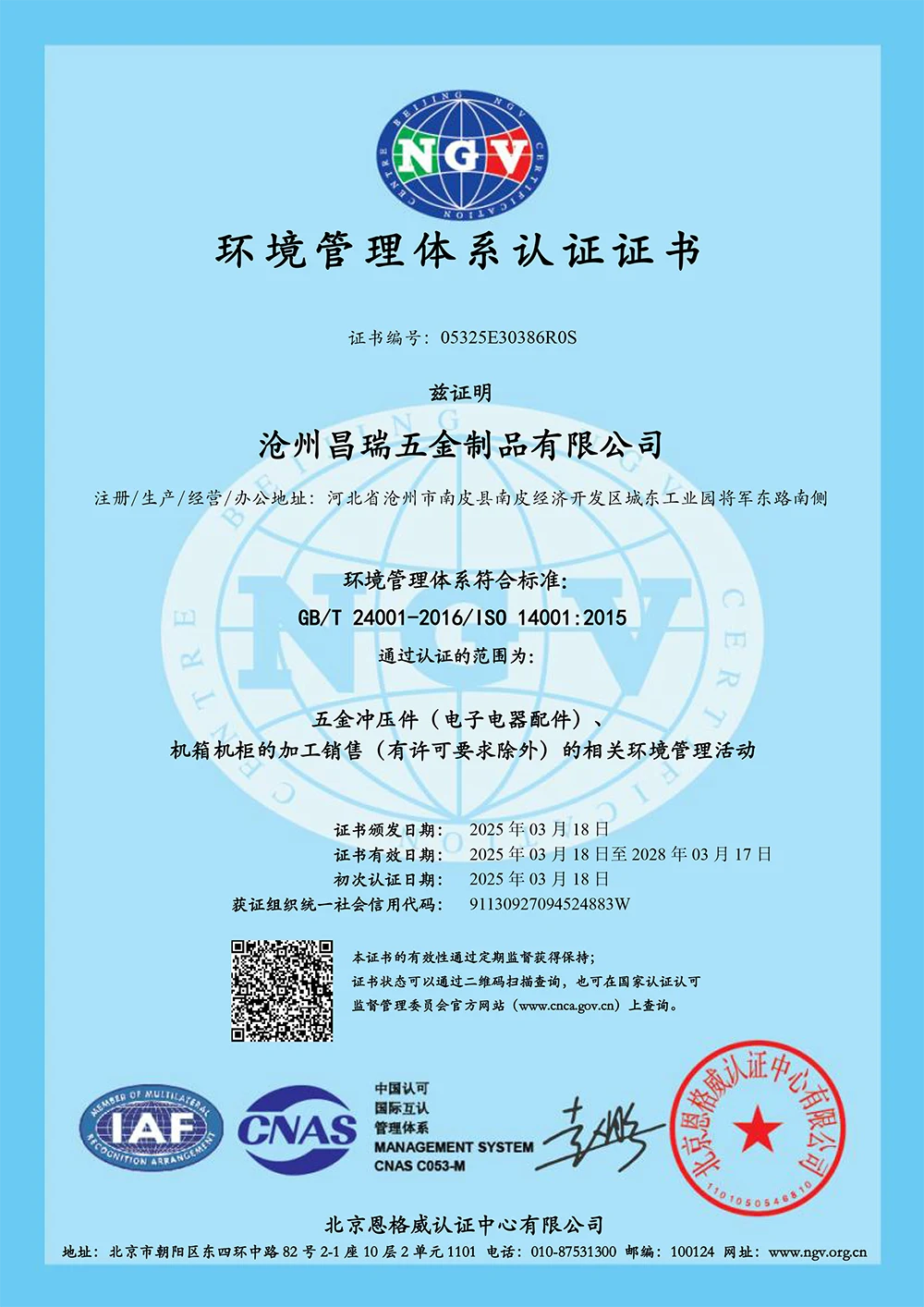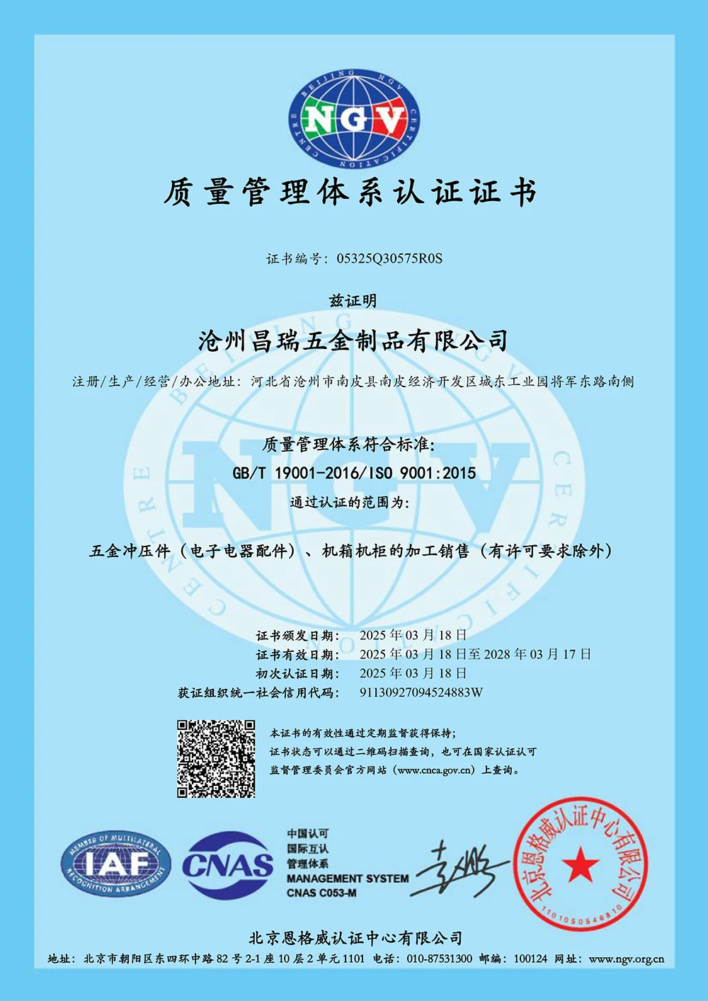 Cangzhou Changrui Technology Co.、Ltd。は、約30,000平方メートルの面積をカバーしています。当社は、ナンピ郡東部経済開発ゾーンの北ハードウェアベース、優れた地理的位置、美しい環境にあり、郡の主要道路の南に位置しています。私たちの工場は、16Tから260Tパンチングマシン、油圧プレス80セット、レーザー切断機、フライス装置、精密粉砕機、レーザーマーキングマシン、プロジェクター、デスクトップ、垂直掘削機、CNC旋盤、CNCベンディングマシン、生産処理およびテスト用品のシリーズを備えた、装備が整っていて、強力な技術的な力を備えています。アルゴンアーク溶接機、2つの保護溶接機、溶接ロボットは60セット近く。ハードウェアオブジェクトの表面コーティング処理のための2つの生産ラインがあります。工場には、管理、技術者、質の高い人材、技術者、オペレーターなど、約80人の従業員がいます。同時に、工場の製品生産は、プロセスに応じて、スタンピングユニット、シートメタルユニット、アセンブリユニット、貯蔵ユニット、スプレーユニット、その他の主要プレートに分割されます。